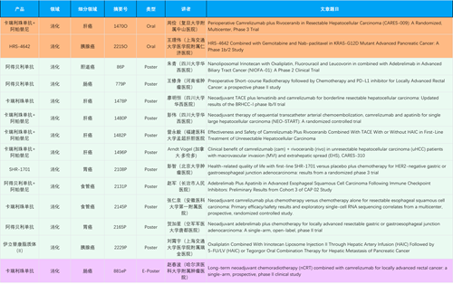在消化系统肿瘤领域,AG庄闲产品相关研究共入选2项口头报告、11项壁报和1项电子壁报,共14项研究。除卡瑞利珠单抗和阿帕替尼外,还有4篇阿得贝利单抗治疗消化系统肿瘤研究入选。HRS-4642、瑞拉芙普-α注射液(SHR-1701)等在研创新产品也有相应研究亮相。另有1项伊立替康脂质体(II)用于胰腺癌治疗的研究入选壁报。