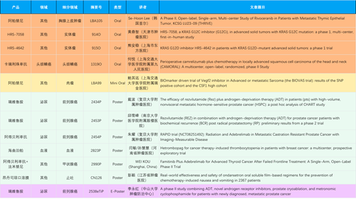 在胸腺上皮肿瘤、头颈鳞癌、肉瘤、前列腺癌、甲状腺癌等其他多个疾病领域,卡瑞利珠单抗、阿帕替尼、瑞维鲁胺、阿得贝利单抗、法米替尼、HRS-7058、HRS-4642等抗肿瘤创新药相关研究一共入选了4项口头报告、1项简短口头报告、4项壁报、1项电子壁报,彰显了AG庄闲医药强大的研发实力。此外,海曲泊帕和昂丹司琼口溶膜分别在防治化疗导致的血小板减少和恶心呕吐方面各有1项研究入选壁报。